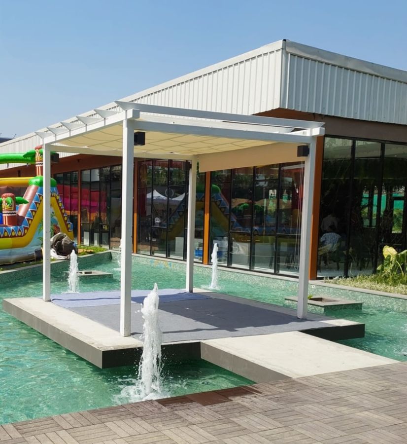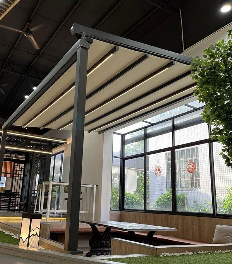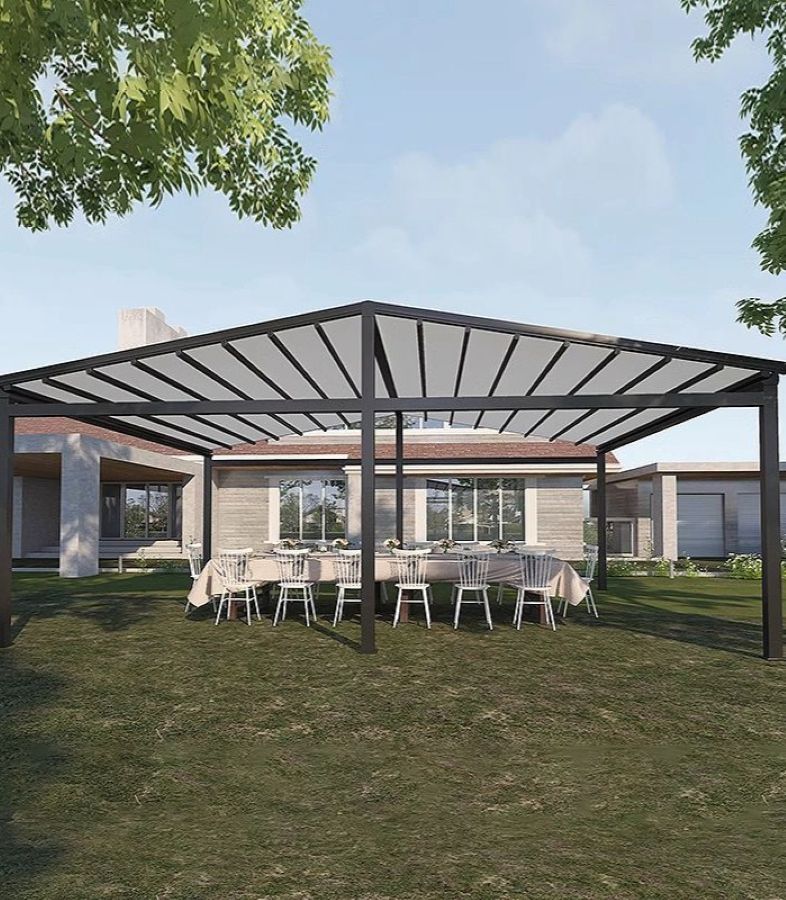 Pergola system:  It is designed to provide an elegant and functional solution for outdoor living spaces. With its motorized feature, users can easily open and close the pergola to adjust the amount of sunlight and shade they desire. The system is also equipped with weather sensors to automatically retract the pergola during harsh weather conditions, providing added protection to the outdoor space